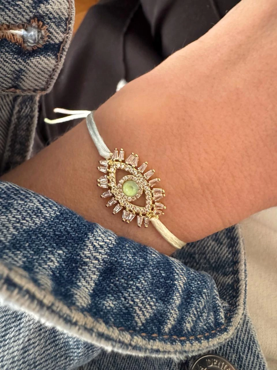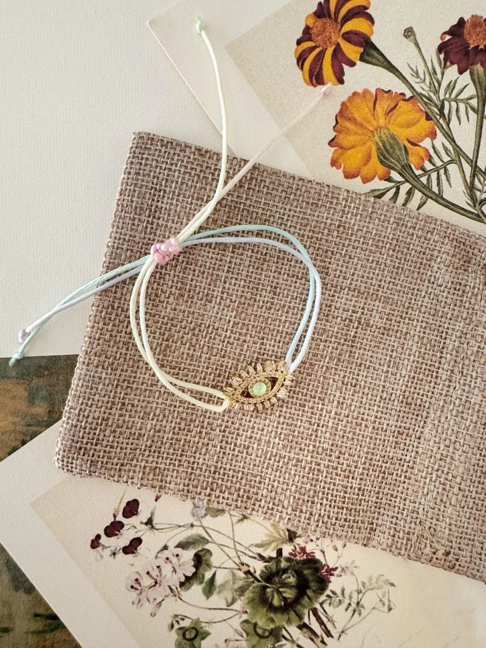 Material: cordón de seda en tonos pasteles y dije ojito bañado en oro con detalle de circones